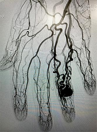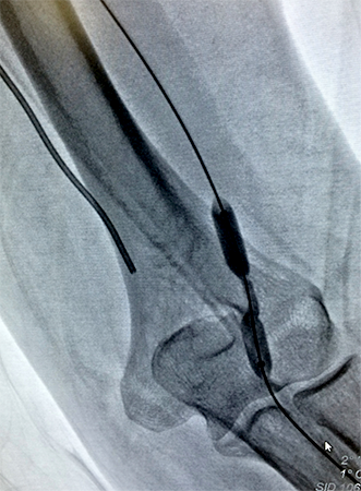 Após adequadamente posicionado, injetamos microesferas de diferentes tamanhos, com a intenção de bloquear o suprimento sanguíneo para o útero. Repetimos todo o procedimento na outra artéria uterina.