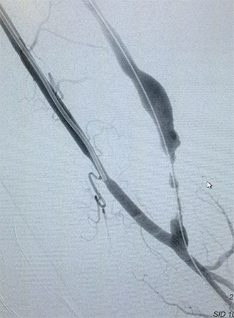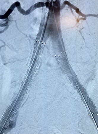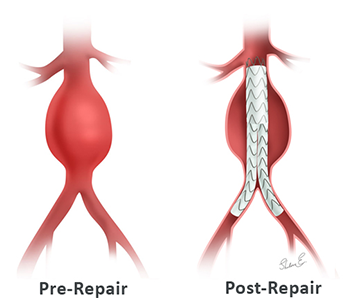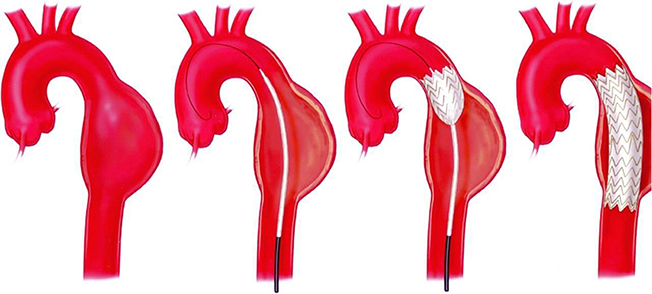 É o tratamento de artérias dilatadas por métodos endovasculares pouco invasivos. O procedimento pode alterar de acordo com a região localizada, do tamanho e da condição do aneurisma. Atualmente a cirurgia vascular dispõe em seu arsenal para o tratamento de aneurismas, um método seguro e menos invasivo que a cirurgia convencional. O tratamento endovascular para aneurismas de aorta, viscerais e periféricos possibilita uma melhora na qualidade de vida dos pacientes de uma forma menos agressiva, objetivando evitar as principais complicações dessas doenças. São utilizados dispositivos de implante totalmente percutâneo e o procedimento é realizado em local específico para estes casos. Após detalhada análise de exames complementares: ultrassom, angiotomografia, angiorressonância, o cirurgião vascular opta pela melhor alternativa de tratamento baseado na anatomia da doença e no perfil de cada paciente.