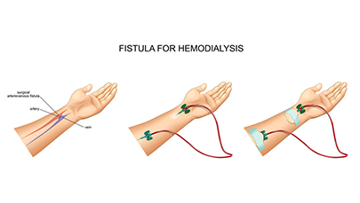 O paciente com insuficiência renal crônica, necessita, periodicamente, da realização de diálise como terapia de substituição renal. A hemodiálise é feita através de cateteres vasculares implantáveis ou de fístulas arteriovenosas construídas cirurgicamente. O cirurgião vascular atua tanto na confecção destas fístulas quanto no tratamento de suas complicações: obstrução, sangramentos, infecção, etc. O tratamento pode ser realizado através de cirurgia convencional ou de cirurgia endovascular, sendo cada caso avaliado pelo especialista.