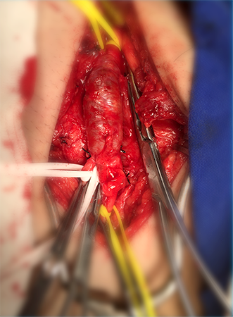 A deposição de colesterol e cálcio na parede das artérias carótidas pode levar ao Acidente Vascular Cerebral Isquêmico, que é a terceira causa mais importante de morte por doença na população. A partir de um determinado grau de estreitamento do vaso, está indicada a correção, seja através de angioplastia com colocação de stent, ou da remoção completa da placa de ateroma pela cirurgia de Endarterectomia. Apesar da Angioplastia com stent representar um avanço no tratamento desta doença, a cirurgia continua sendo a principal forma de correção para a maioria dos pacientes. Feita com anestesia geral, através de uma incisão no pescoço, o cirurgião abre a artéria doente, e remove toda a placa que provoca o estreitamento. Normalmente são necessários dois dias de internação hospitalar e o paciente estará apto a retomar suas atividades diárias imediatamente.
